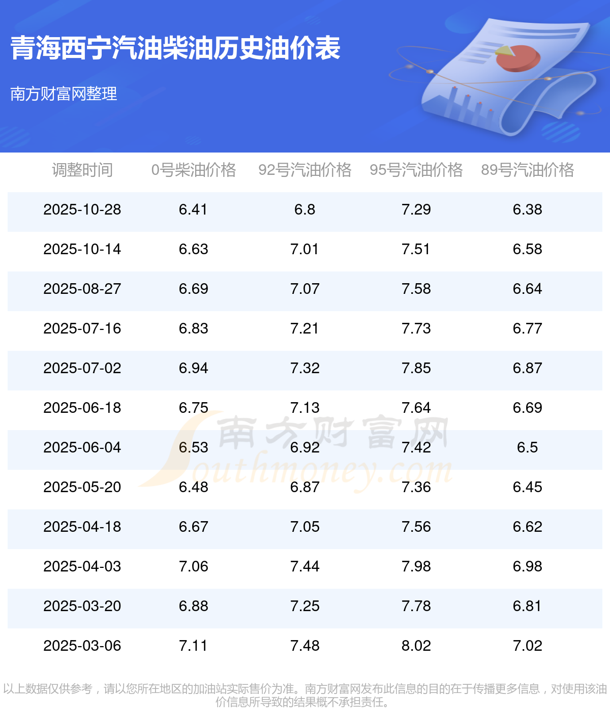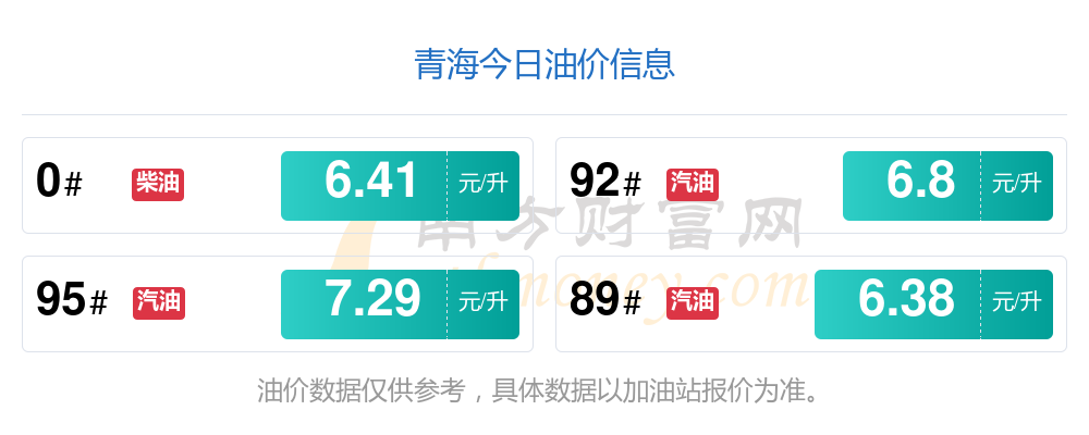 11月4日青海西寧汽油、柴油每升價格詳情為:92號汽油為6.8元,下降了0.21元;95號汽油為7.29元,下降了0.22元;89號汽油為6.38元,下降了0.2元;0號柴油為6.41元,下降了0.22元,本次油價調整時間為10月28日。