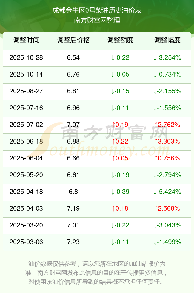 成都金牛區(qū)0號(hào)柴油歷史油價(jià)一覽表