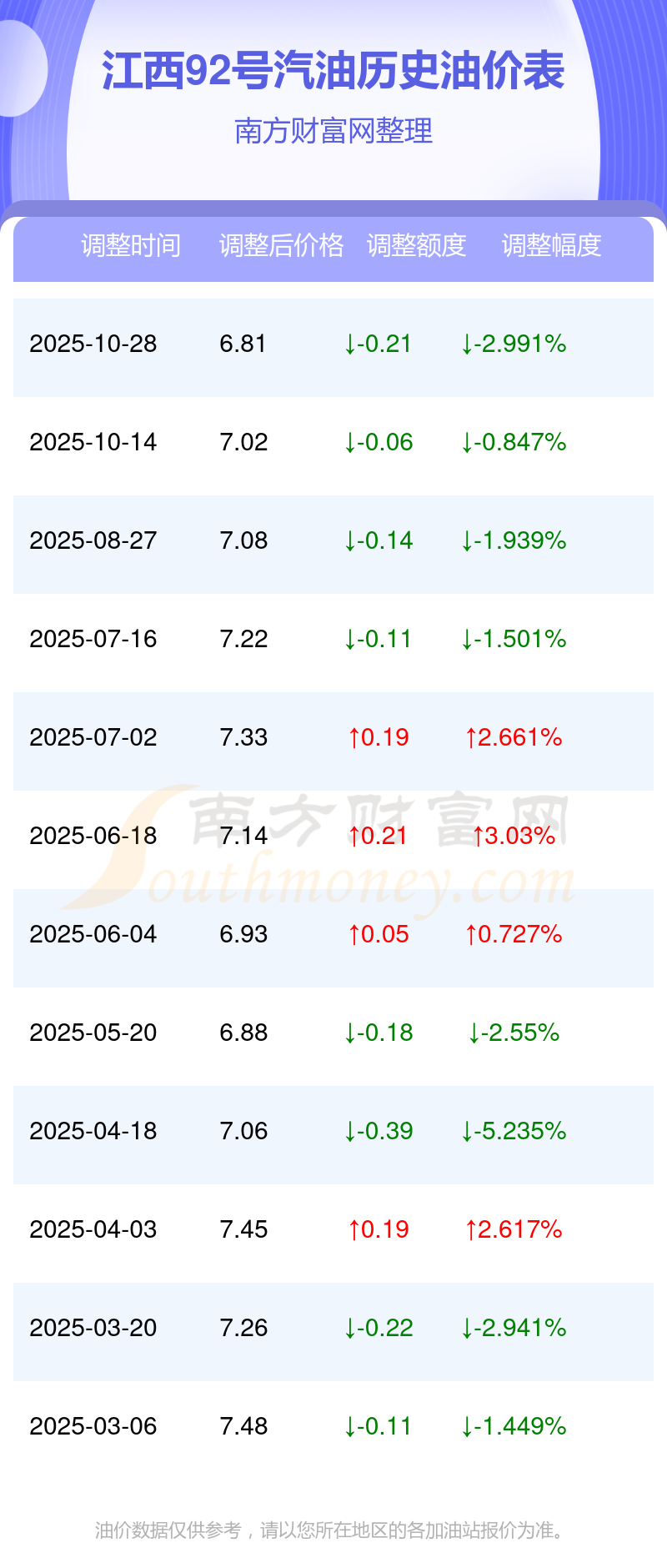 11月6日,江西92號汽油的價格是6.81元每升,本次的調(diào)整時間為10月28日,對比上次的調(diào)整下調(diào)了0.21元,下調(diào)2.991%,11月10日24時為下一輪油價調(diào)整時間,還有4.53天。