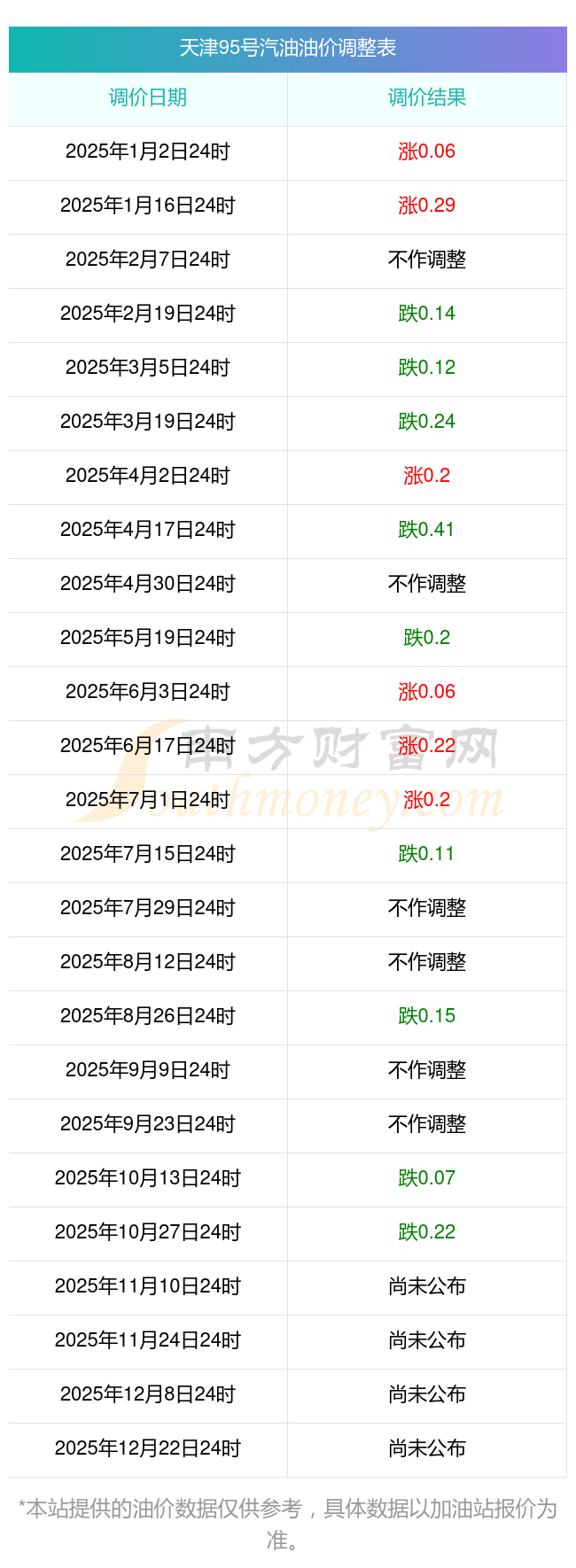 11月6日,天津汽油、柴油價格的調(diào)整時間為10月28日。每升最新價格為:92號汽油為6.83元,跌了0.21元;95號汽油為7.22元,跌了0.22元;89號汽油為6.33元,跌了0.2;0號柴油為6.47元,跌了0.22元。
