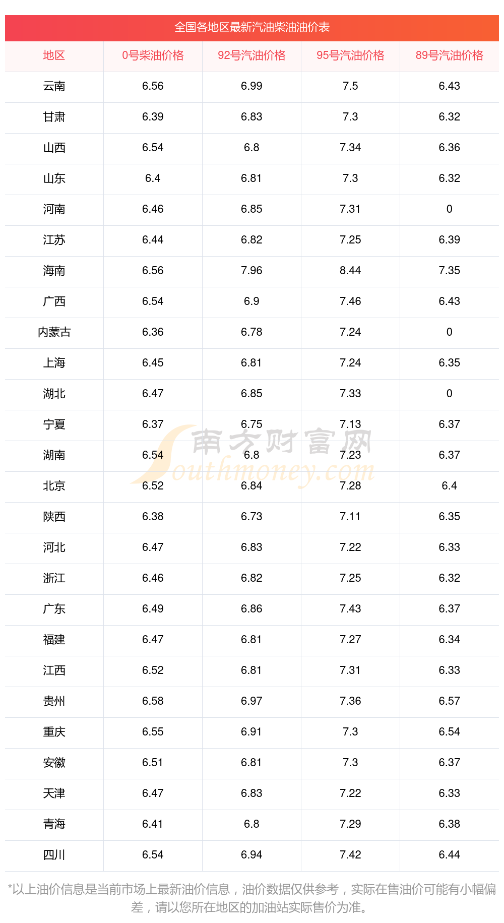油價數(shù)據(jù)僅供參考,請以您所在地區(qū)的加油站報價為準。南方財富網(wǎng)發(fā)布此信息的目的在于傳播更多信息,對使用該油價信息所導致的結果概不承擔任何責任。