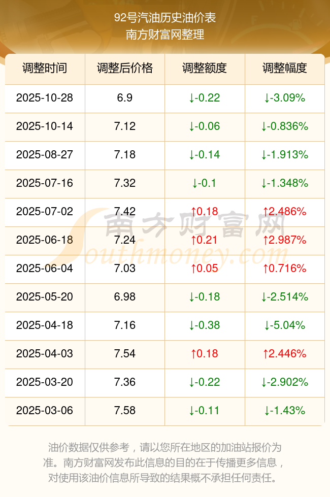 11月6日,汽油、柴油每升的價格是多少?本次油價調(diào)整時間是10月28日,92號汽油為6.9元,下跌了0.22元,下跌幅達(dá)3.09%;95號汽油為7.46元,下跌了0.23元,下跌幅達(dá)2.99%;89號汽油為6.43元,下跌了0.19元,下跌幅達(dá)2.87%;0號柴油為6.54元,下跌了0.22元,下跌幅達(dá)3.25%。下一輪油價調(diào)整時間11月10日24時,距離現(xiàn)在還有4.52天。