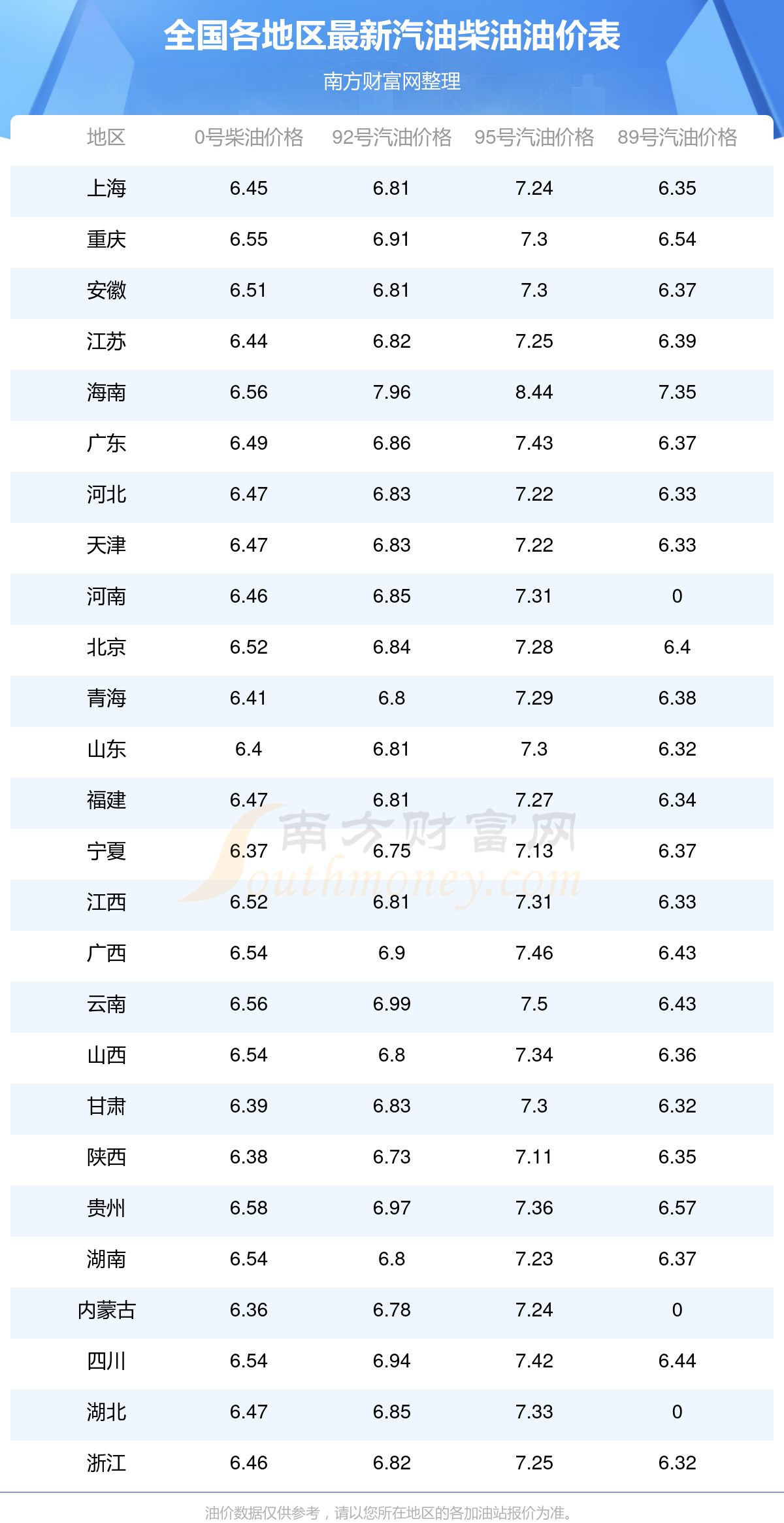 油價(jià)數(shù)據(jù)僅供參考,請(qǐng)以您所在地區(qū)的加油站報(bào)價(jià)為準(zhǔn)。南方財(cái)富網(wǎng)發(fā)布此信息的目的在于傳播更多信息,對(duì)使用該油價(jià)信息所導(dǎo)致的結(jié)果概不承擔(dān)任何責(zé)任。