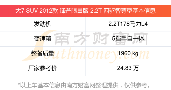 在動力上,大7 SUV 2012款 鋒芒限量版 2.2T 四驅(qū)智尊型配備的是一臺2.2T178馬力L4渦輪增壓發(fā)動機,匹配的是5擋手自一體自動檔變速箱,燃料形式為汽油,常規(guī)整備質(zhì)量1960kg,廠家參考價24.83萬元。