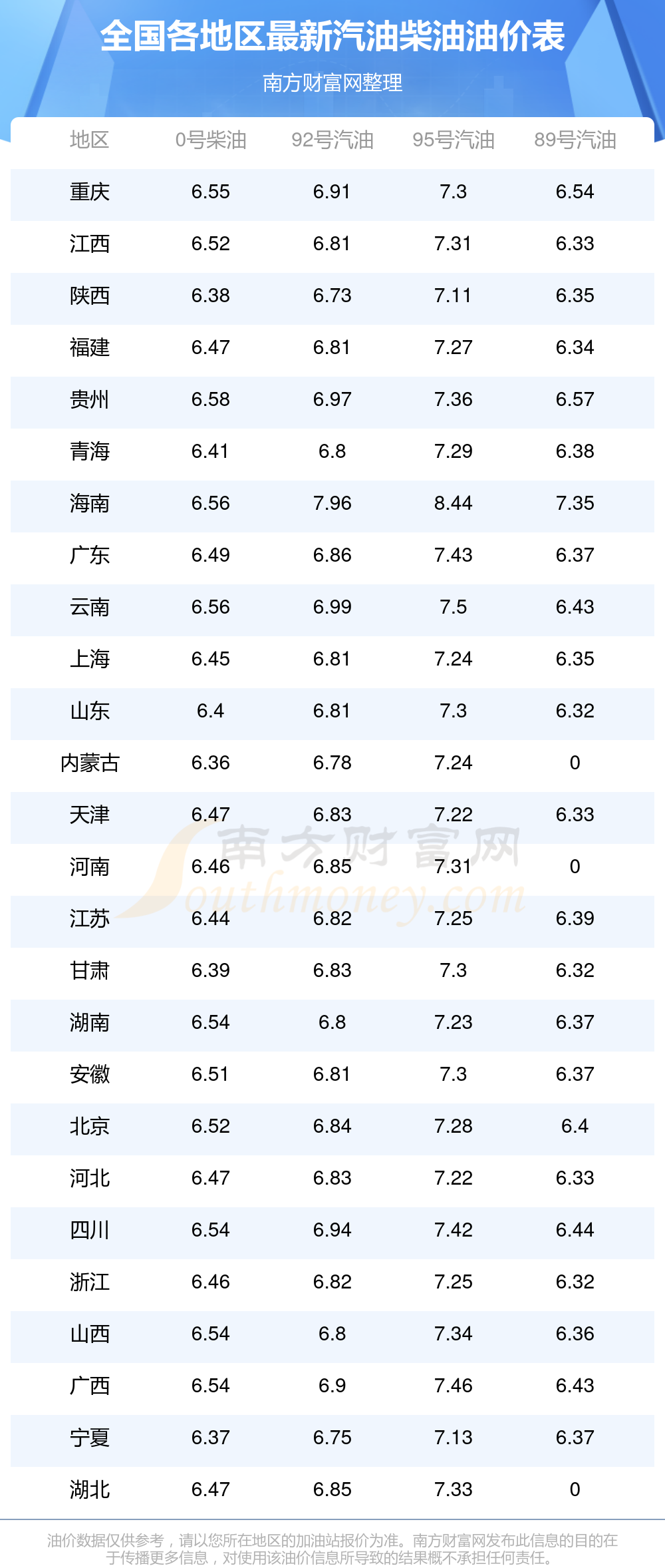 0號柴油平均價格:6元每升,其中,最高為貴州,價格為6.58元/升,最低為內(nèi)蒙古,價格為6.36元/升。
