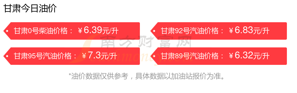 11月6日甘肅汽油、柴油最新價格:本次油價調(diào)整時間是10月28日,92號汽油6.83元,跌了0.22元,跌幅達3.12%;95號汽油7.3元,跌了0.22元,跌幅達2.93%;89號汽油6.32元,跌了0.19元,跌幅達2.92%;0號柴油6.39元,跌了0.22元,跌幅達3.33%。