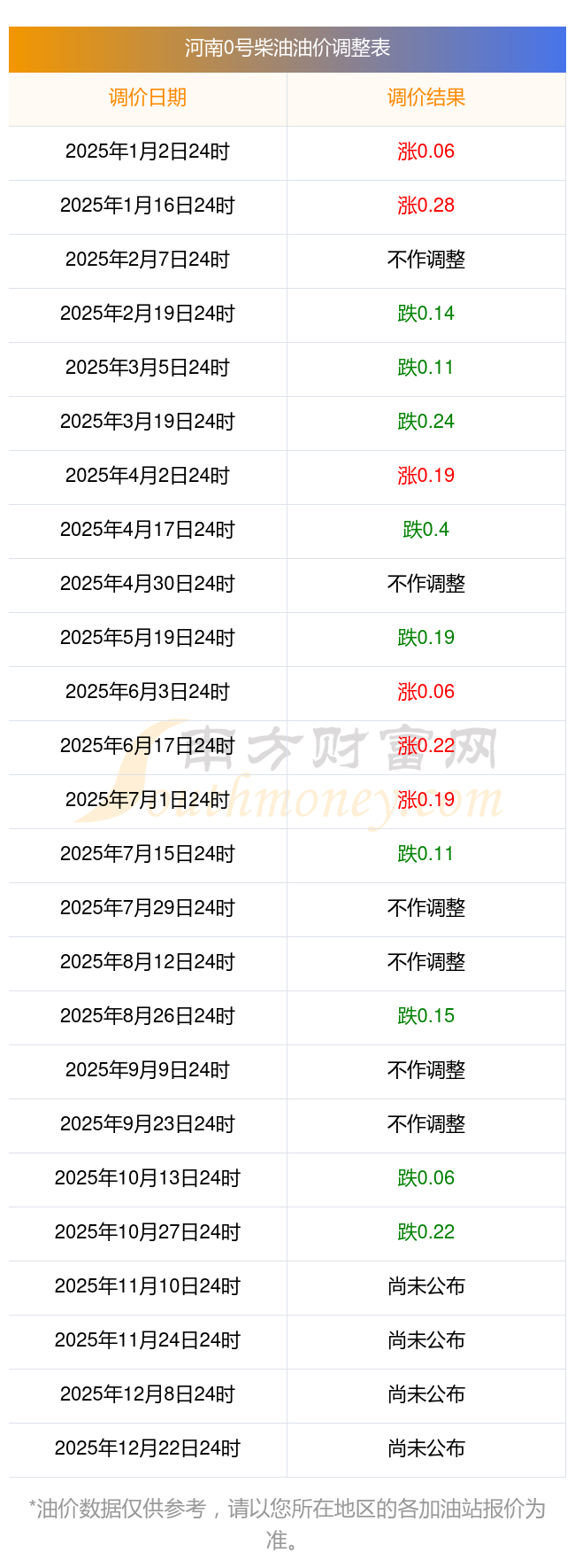 11月6日,河南0號柴油的價格是6.46元每升,本次的調(diào)整時間為10月28日,對比上次的調(diào)整跌了0.22元,跌3.293%,11月10日24時為下一輪油價調(diào)整時間,還有4.5天。