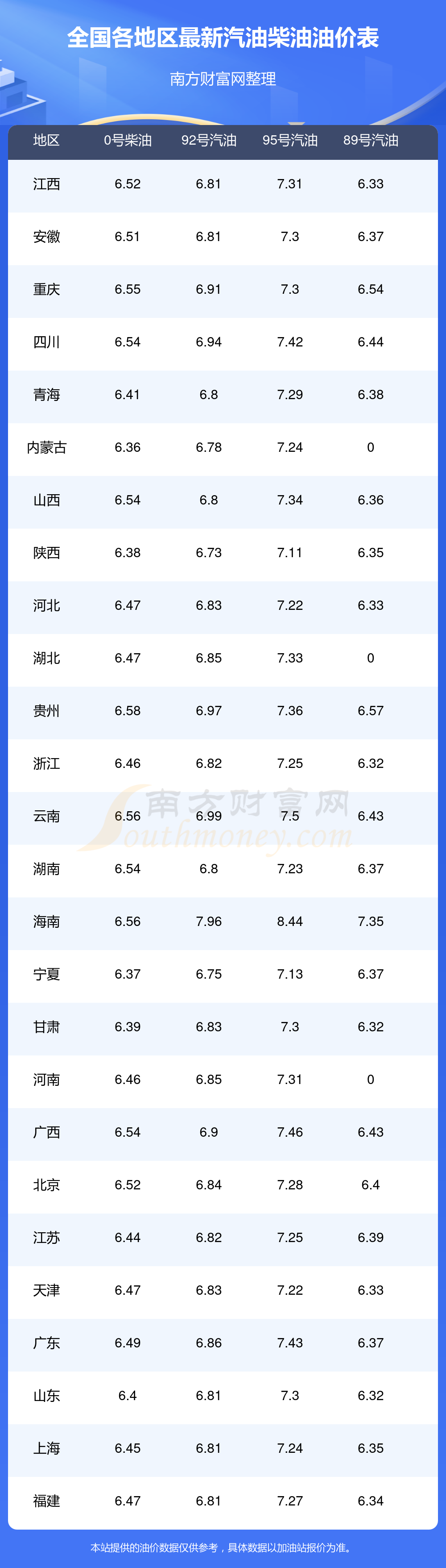 油價數(shù)據(jù)僅供參考,請以您所在地區(qū)的加油站報價為準(zhǔn)。南方財富網(wǎng)發(fā)布此信息的目的在于傳播更多信息,對使用該油價信息所導(dǎo)致的結(jié)果概不承擔(dān)任何責(zé)任。
