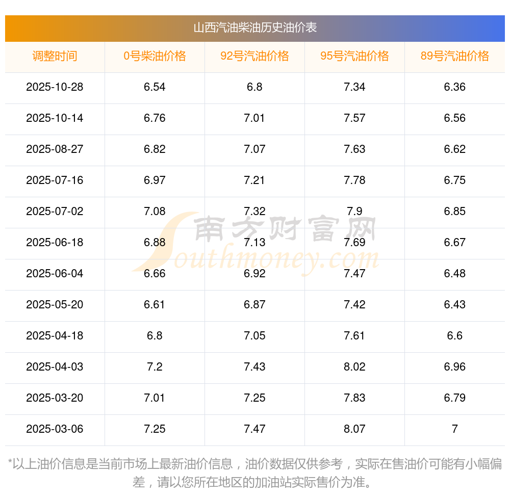 11月6日,山西0號柴油的價格是6.54元每升,本次的調(diào)整時間為10月28日,對比上次的調(diào)整下跌了0.22元,下跌3.254%,下次調(diào)整時間為11月10日24時,還有4.49天。
