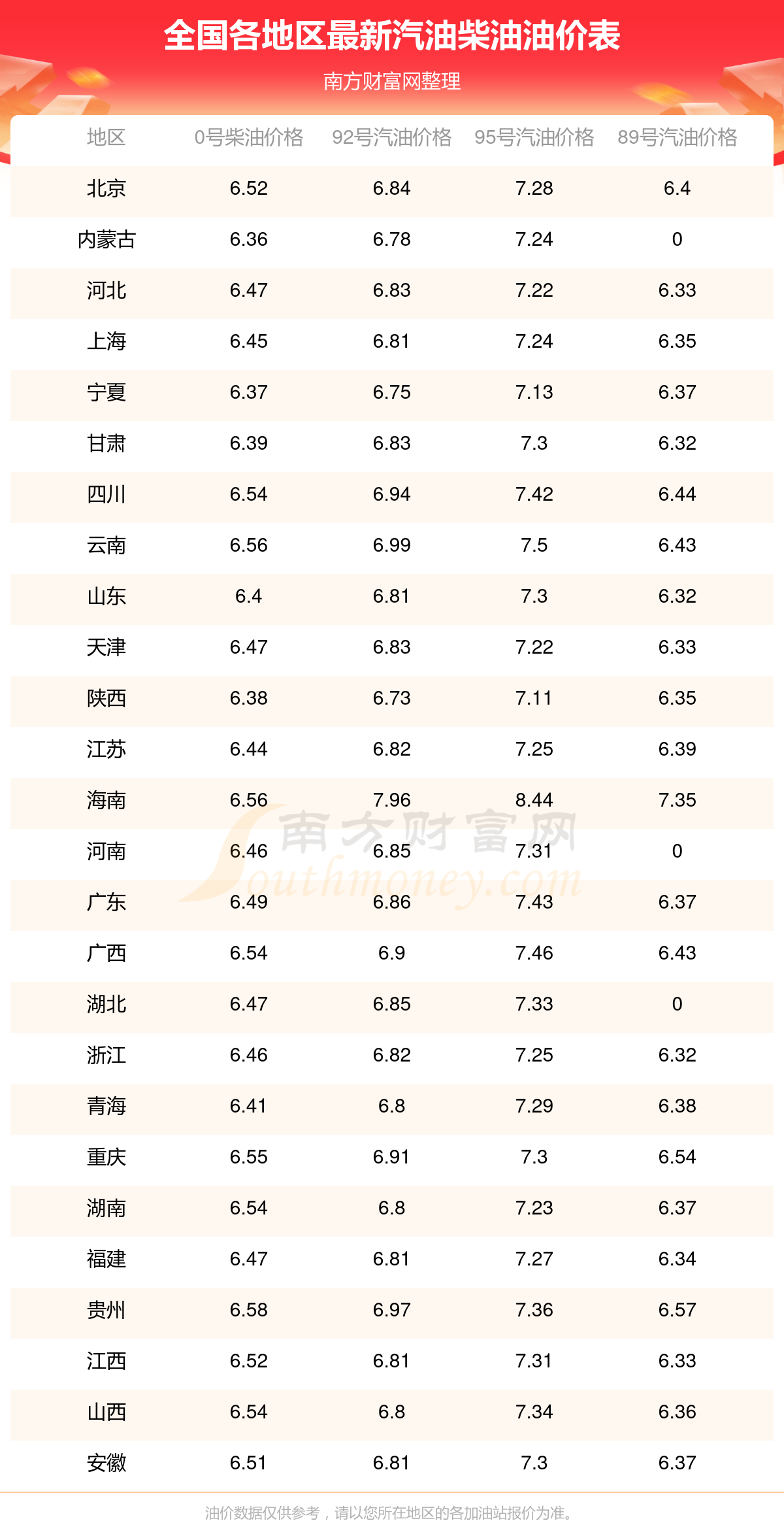 2025年11月6日全國油價調(diào)整及最新汽油價格表