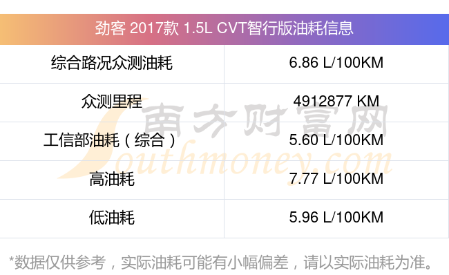 根據(jù)多位車主實(shí)測(cè)得出數(shù)據(jù),該車型低油耗為5.96升/百公里,高油耗為7.77升/百公里,綜合路況眾測(cè)油耗為6.86升/百公里,工信部綜合油耗為5.60升/百公里。