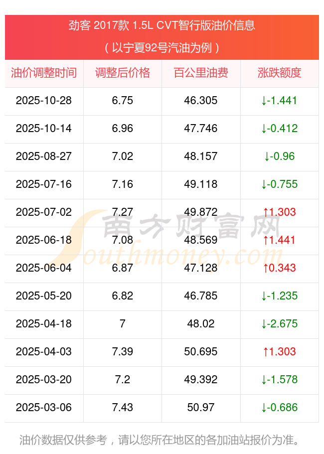 依照10月28日92號(hào)汽油最新調(diào)整價(jià)格6.75元/升來(lái)計(jì)算(以寧夏為例),該車型百公里的平均油費(fèi)是46.305元,依照上一輪10月14日調(diào)整價(jià)格6.96元/升來(lái)計(jì)算,百公里的平均油費(fèi)是47.746元,對(duì)比上一輪少花1.441元,下一輪的油價(jià)調(diào)整時(shí)間11月10日24時(shí)。