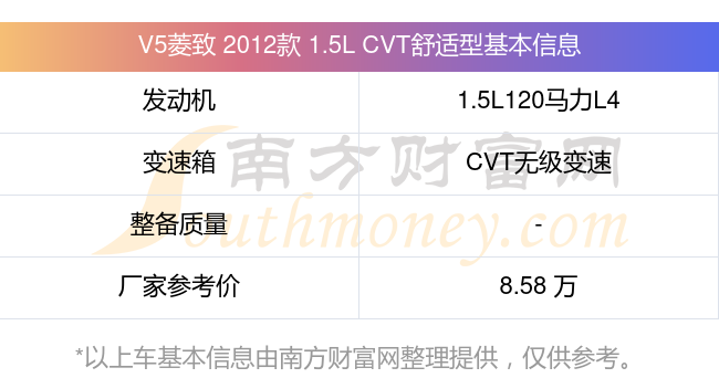 V5菱致 2012款 1.5L CVT舒適型動(dòng)力上配備的是一臺(tái)1.5L120馬力L4自然吸氣發(fā)動(dòng)機(jī),匹配的是CVT無級變速自動(dòng)檔變速箱,燃料形式為汽油,廠家參考價(jià)8.58萬元。