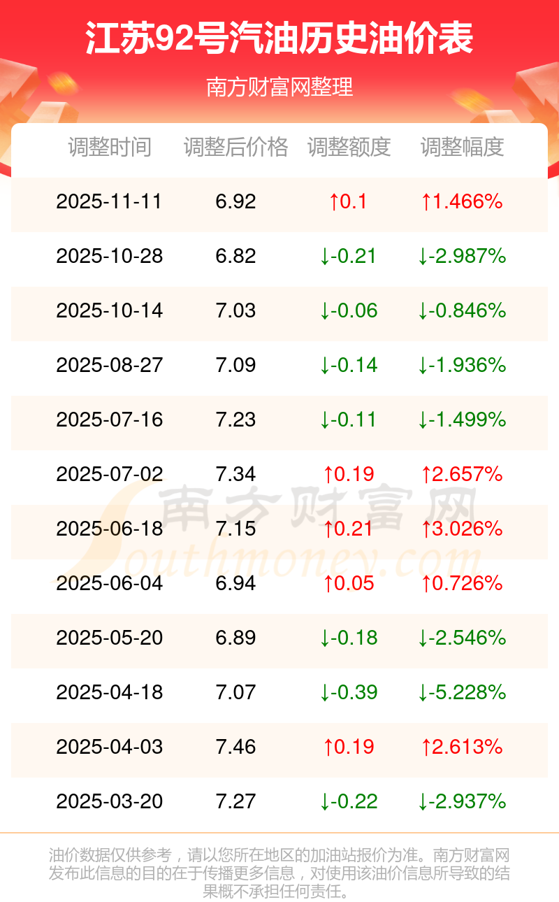 11月11日,江蘇92號汽油的價格是6.92元每升,本次的調(diào)整時間為11月11日,對比上次的調(diào)整上調(diào)了0.1元,上調(diào)1.466%,11月24日24時為下一輪油價調(diào)整時間,還有13.38天。