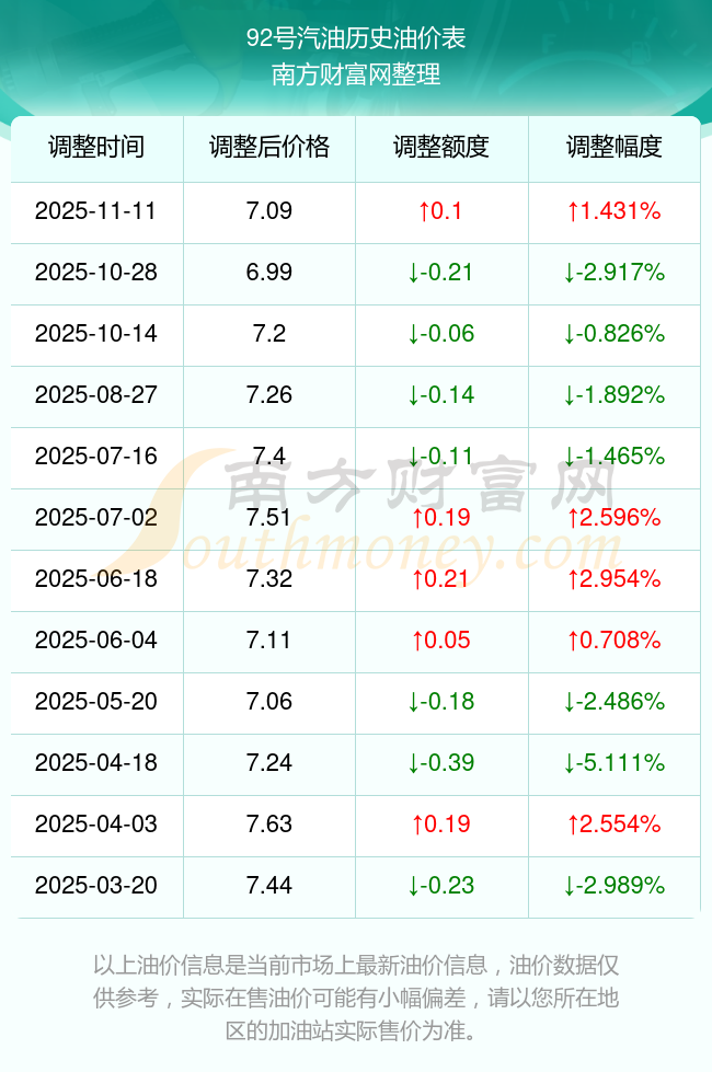 油價(jià)調(diào)整最新消息:下一輪油價(jià)調(diào)整時(shí)間11月24日24時(shí)。11月11日云南汽油、柴油最新價(jià)格:本次油價(jià)調(diào)整時(shí)間是11月11日,92號(hào)汽油7.09元,上漲了0.1元,上漲幅達(dá)1.43%;95號(hào)汽油7.61元,上漲了0.11元,上漲幅達(dá)1.47%;89號(hào)汽油6.53元,上漲了0.1元,上漲幅達(dá)1.56%;0號(hào)柴油6.66元,上漲了0.1元,上漲幅達(dá)1.52%。