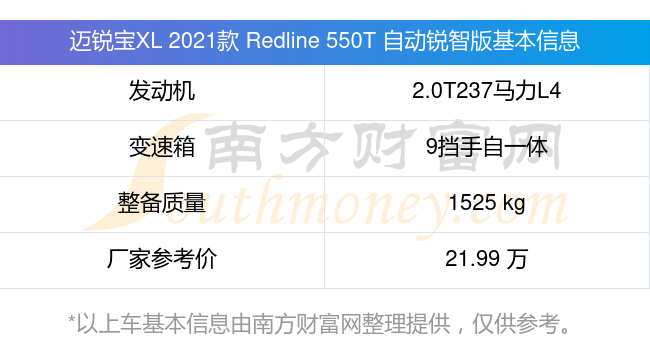 在動力方面,邁銳寶XL 2021款 Redline 550T 自動銳智版搭載的是一臺2.0T237馬力L4渦輪增壓發(fā)動機,匹配9擋手自一體自動檔變速箱,燃料形式為汽油,常規(guī)整備質量1525kg,廠家參考價21.99萬元。