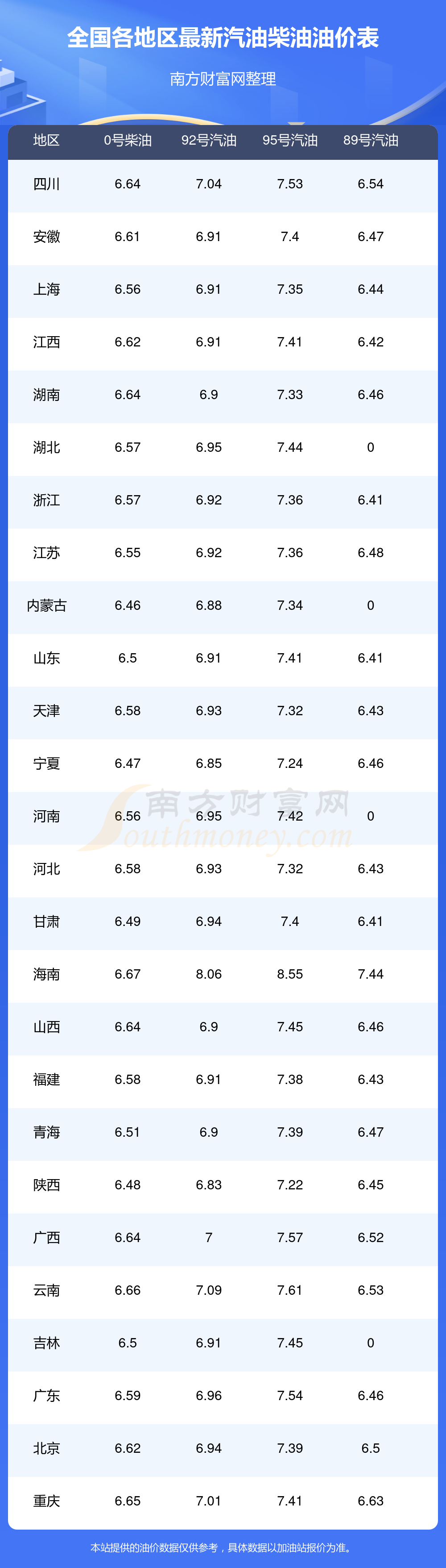 這一輪油價調整的時間是11月11日,調整后全國油價的具體價格為:92號汽油平均價格為7元每升,其中,最低的是陜西,6.83元每升,最高的是海南,8.06元每升。95號汽油平均價格為7元每升,其中,最低的是陜西,7.22元每升,最高的是海南,8.55元每升。0號柴油平
