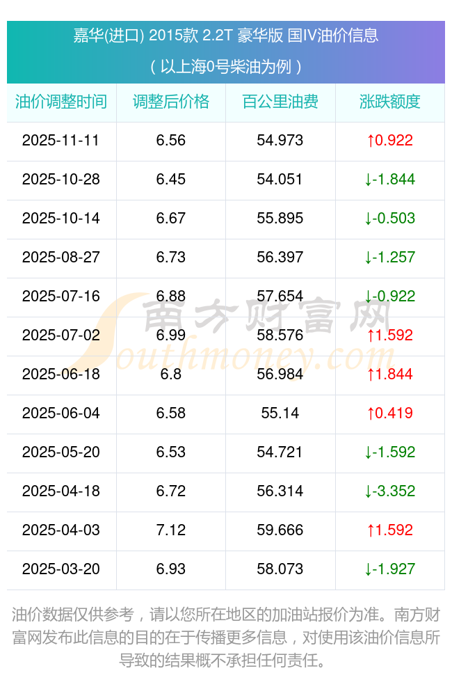按照11月11日0號(hào)柴油最新調(diào)整價(jià)格6.56元/升來(lái)計(jì)算(以上海為例),該車(chē)型百公里平均油費(fèi)為54.973元,按照上一輪10月28日調(diào)整價(jià)格6.45元/升來(lái)計(jì)算,百公里平均油費(fèi)為54.051元,對(duì)比上一輪多花0.922元,下一輪油價(jià)調(diào)整時(shí)間為11月24日24時(shí)。