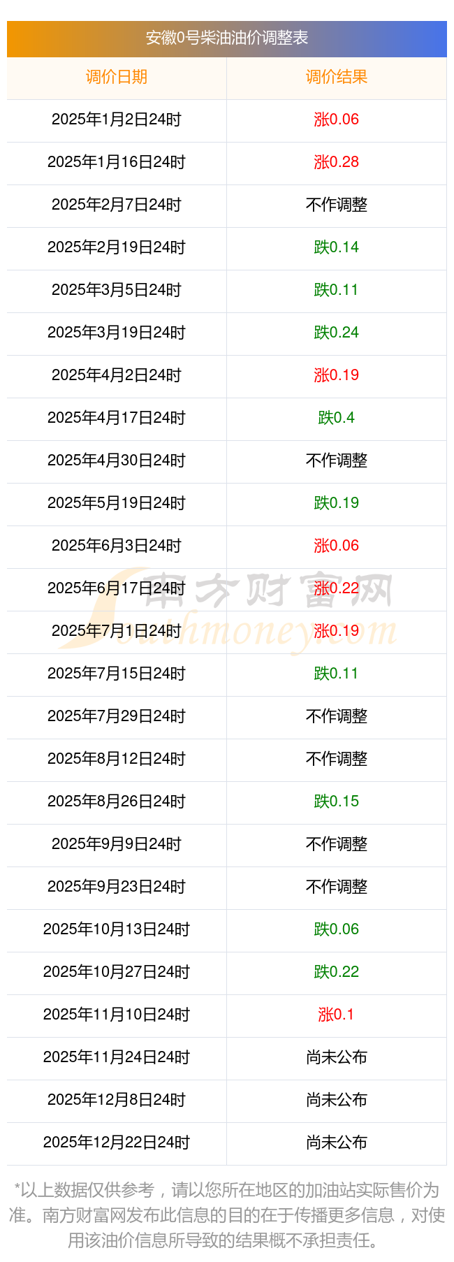 11月11日,安徽0號(hào)柴油的價(jià)格是6.61元每升,本次的調(diào)整時(shí)間為11月11日,對(duì)比上次的調(diào)整上升了0.1元,上升1.536%,11月24日24時(shí)為下一輪油價(jià)調(diào)整時(shí)間,還有13.36天。