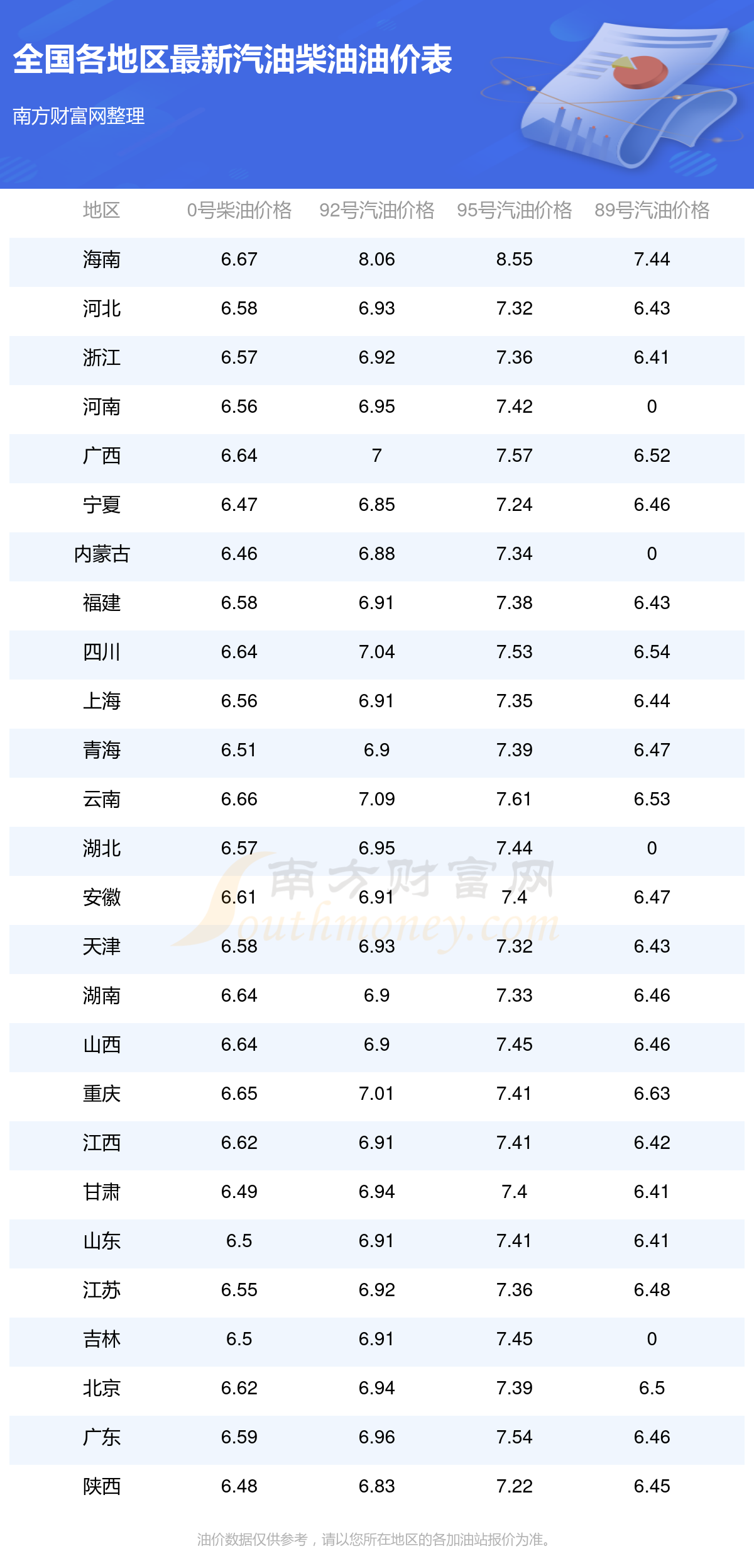 以上數(shù)據(jù)僅供參考,請(qǐng)以您所在地區(qū)的加油站實(shí)際售價(jià)為準(zhǔn)。南方財(cái)富網(wǎng)發(fā)布此信息的目的在于傳播更多信息,對(duì)使用該油價(jià)信息所導(dǎo)致的結(jié)果概不承擔(dān)責(zé)任。