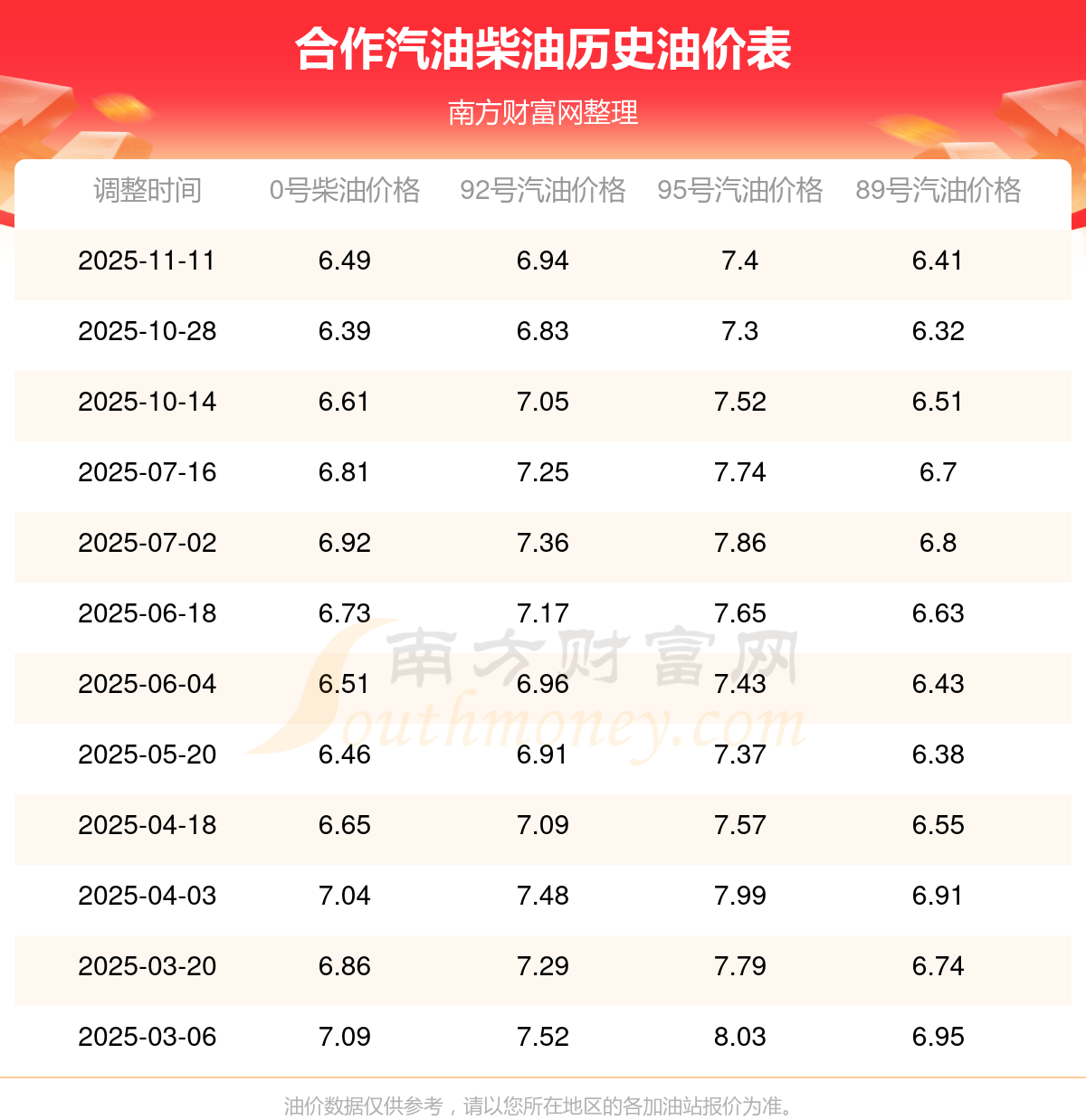 合作汽油柴油11月11日每升的價格為11月11日調(diào)整后的價格,各油價詳情如下:92號汽油6.94元;95號汽油7.4元;89號汽油6.41元;0號柴油6.49元。