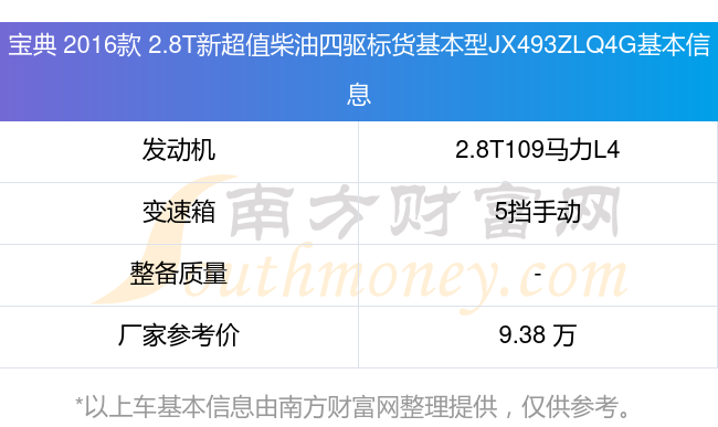 在動(dòng)力方面,寶典 2016款 2.8T新超值柴油四驅(qū)標(biāo)貨基本型JX493ZLQ4G搭載的是一臺(tái)2.8T109馬力L4渦輪增壓發(fā)動(dòng)機(jī),匹配5擋手動(dòng)擋變速箱,燃料形式為柴油,廠家參考價(jià)9.38萬元。
