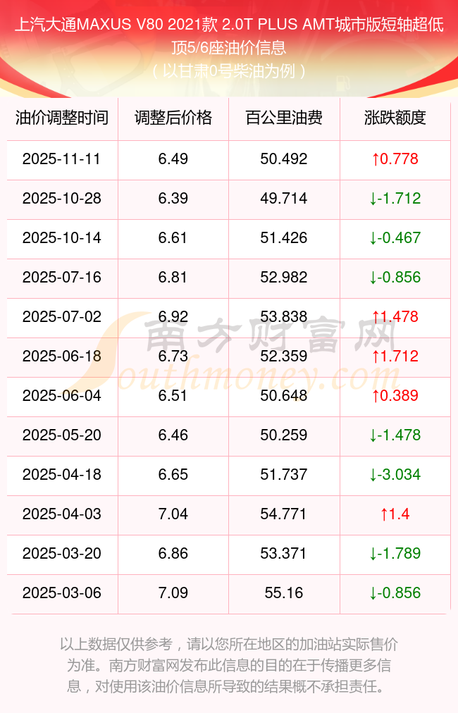 依照11月11日0號柴油最新調(diào)整價格6.49元/升來計算(以甘肅為例),該車型百公里的平均油費(fèi)是50.492元,依照上一輪10月28日調(diào)整價格6.39元/升來計算,百公里的平均油費(fèi)是49.714元,對比上一輪多花0.778元,下一輪的油價調(diào)整時間11月24日24時。