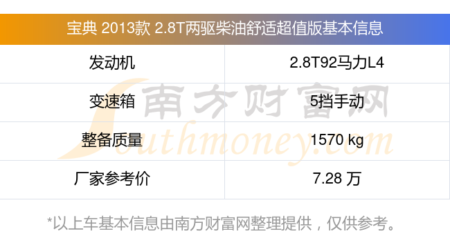 在動(dòng)力上,寶典 2013款 2.8T兩驅(qū)柴油舒適超值版配備的是一臺(tái)2.8T92馬力L4渦輪增壓發(fā)動(dòng)機(jī),匹配的是5擋手動(dòng)擋變速箱,燃料形式為柴油,常規(guī)整備質(zhì)量1570kg,廠家參考價(jià)7.28萬元。