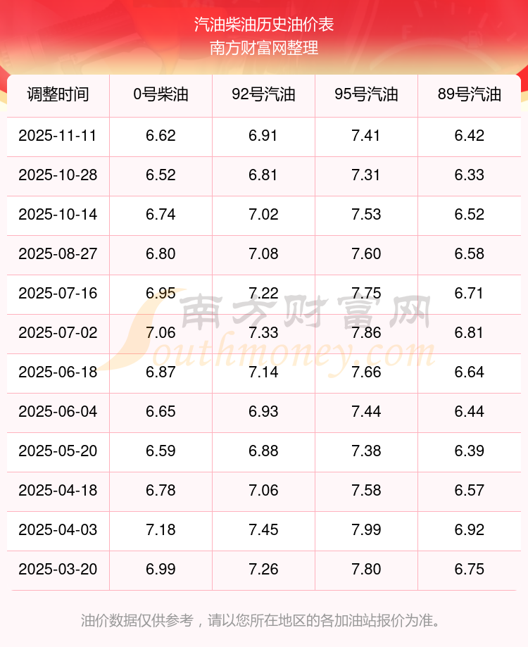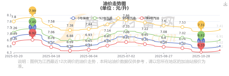 江西萍鄉(xiāng)92號汽油11月11日最新價(jià)格為11月11日油價(jià)調(diào)整后的價(jià)格,具體為6.91元/升,相對上次調(diào)整時(shí)間10月28日的油價(jià)6.81元每升,共漲了0.1元,漲1.468%。下一輪油價(jià)調(diào)整時(shí)間11月24日24時(shí),距離現(xiàn)在還有13.31天。