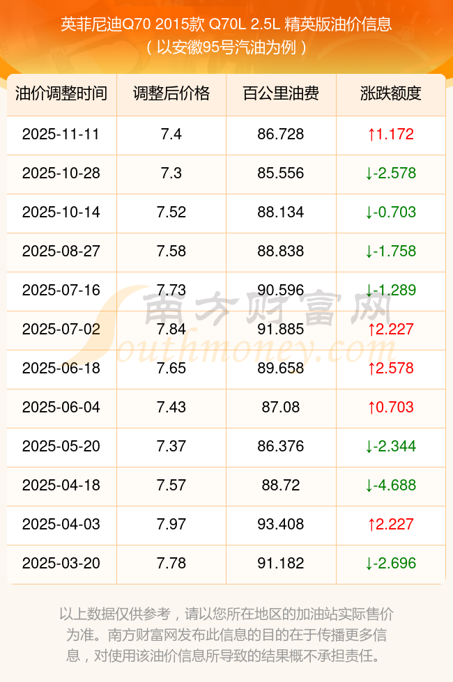 英菲尼迪Q70 2015款 Q70L 2.5L 精英版一公里需要多少油費(11月11日)全國油價一覽表