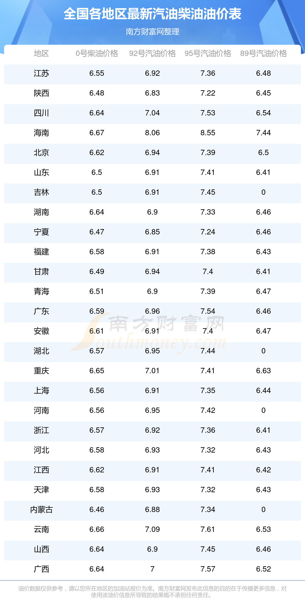 附:最新全國汽油、柴油價格一覽表