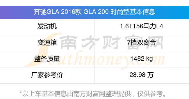 在動(dòng)力方面,奔馳GLA 2016款 GLA 200 時(shí)尚型搭載的是一臺(tái)1.6T156馬力L4渦輪增壓發(fā)動(dòng)機(jī),匹配7擋雙離合自動(dòng)檔變速箱,燃料形式為汽油,常規(guī)整備質(zhì)量1482kg,廠家參考價(jià)28.98萬元。