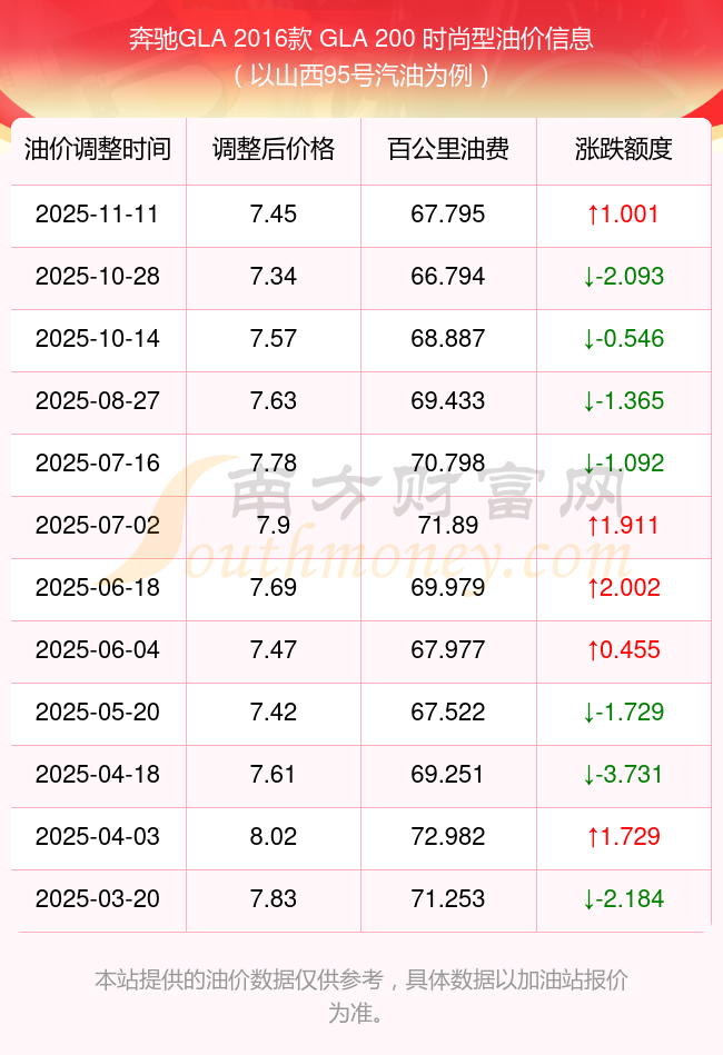 根據(jù)11月11日95號(hào)汽油最新調(diào)整價(jià)格7.45元/升來計(jì)算(以山西為例),該車型每百公里的平均油費(fèi)是67.795元,上一輪10月28日調(diào)整價(jià)格7.34元每升來計(jì)算,每百公里的平均油費(fèi)是66.794元,對(duì)比上一輪多花1.001元,下一輪的油價(jià)調(diào)整時(shí)間是11月24日24時(shí)。