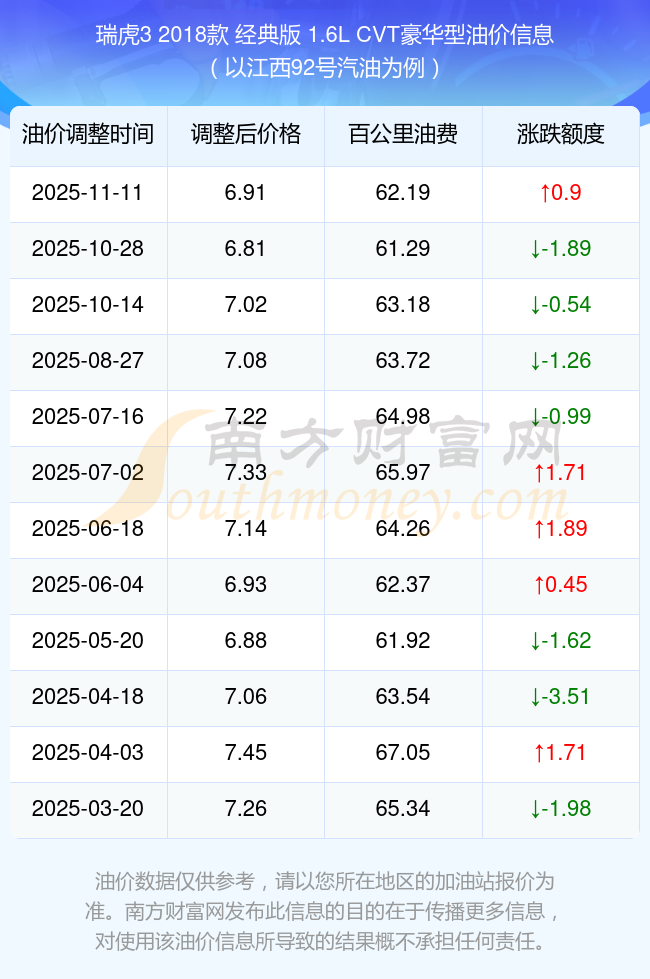 油價(jià)調(diào)整最新消息:下一輪油價(jià)調(diào)整時(shí)間11月24日24時(shí)。 11月11日弋江區(qū)汽油柴油每升的價(jià)格為11月11日調(diào)整后的價(jià)格,具體如下:92號(hào)汽油6.91元;95號(hào)汽油7.4元;89號(hào)汽油6.47元;0號(hào)柴油6.61元。 2025年弋江區(qū)汽油價(jià)格一覽表 2025年弋江區(qū)油價(jià)調(diào)整時(shí)間表 副