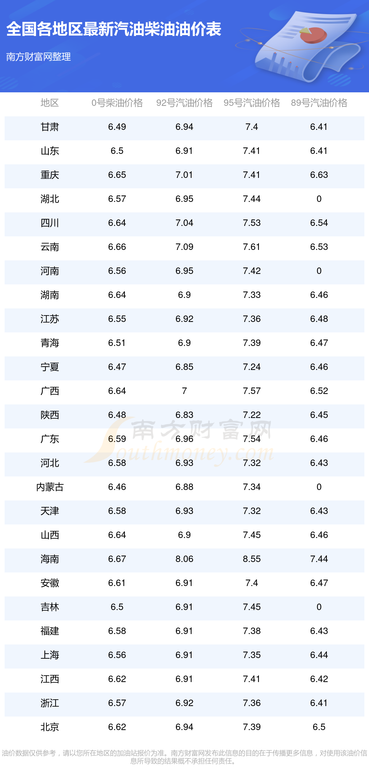 油價(jià)數(shù)據(jù)僅供參考,請(qǐng)以您所在地區(qū)的加油站報(bào)價(jià)為準(zhǔn)。南方財(cái)富網(wǎng)發(fā)布此信息的目的在于傳播更多信息,對(duì)使用該油價(jià)信息所導(dǎo)致的結(jié)果概不承擔(dān)任何責(zé)任。