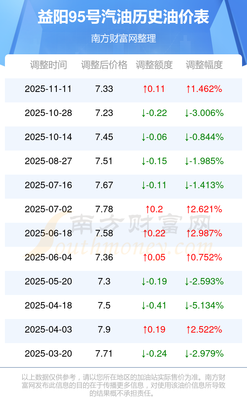 11月11日,益陽95號汽油的價格為7.33元/升,這是11月11日油價調(diào)整后的價格,對比上一輪油價調(diào)整時間10月28日的價格7.23元每升,上調(diào)了0.11元,上調(diào)幅達1.462%。下一輪油價調(diào)整時間11月24日24時,距離現(xiàn)在還有13.26天。