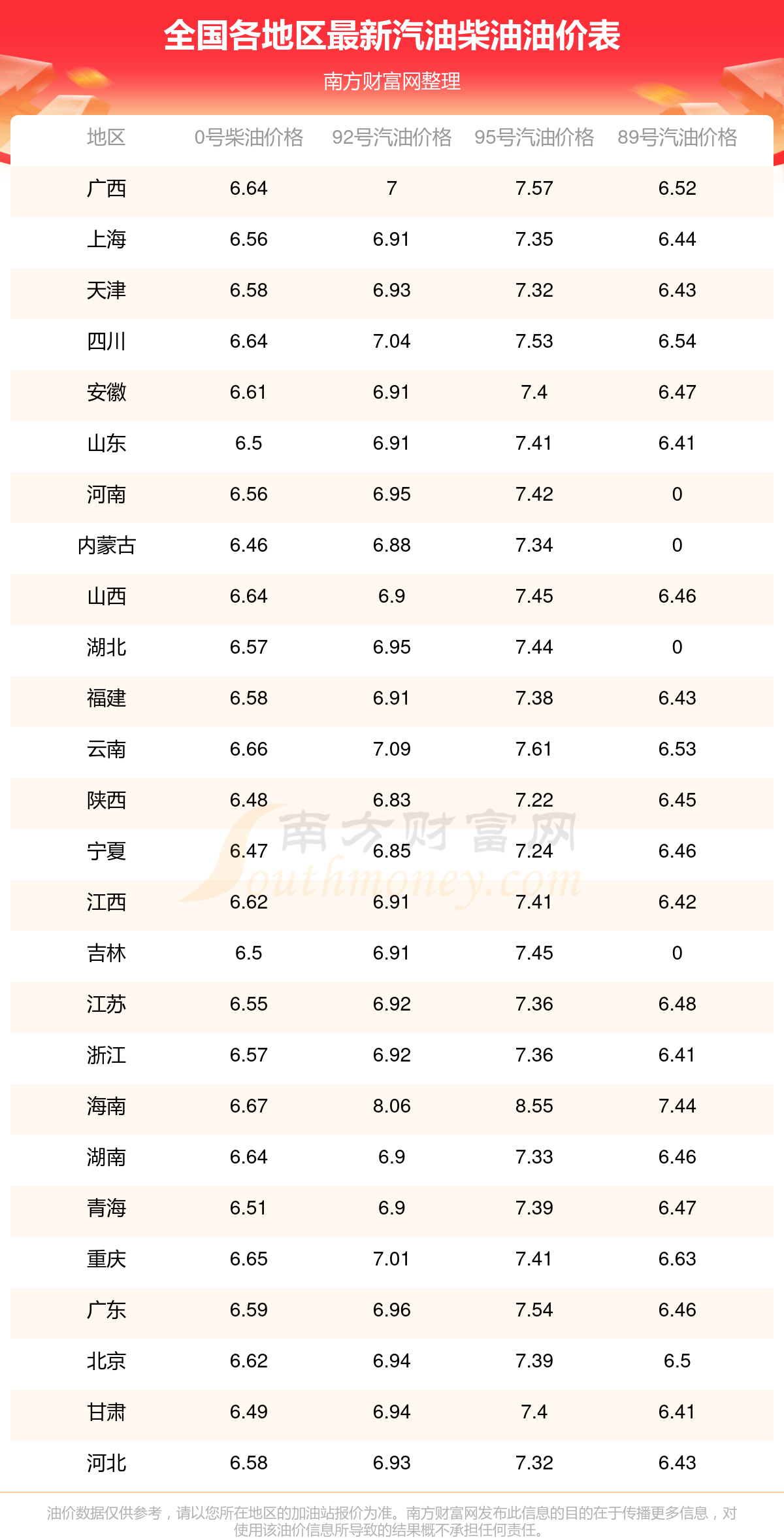 全國0號(hào)柴油平均價(jià)格為:7元每升,其中,最低為內(nèi)蒙古,價(jià)格6.46元/升,最高為海南,價(jià)格6.67元/升。