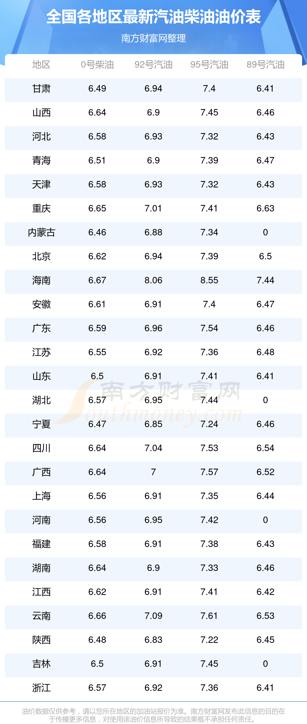 全國(guó)各地區(qū)2025年最新油價(jià)表