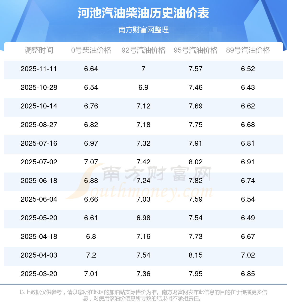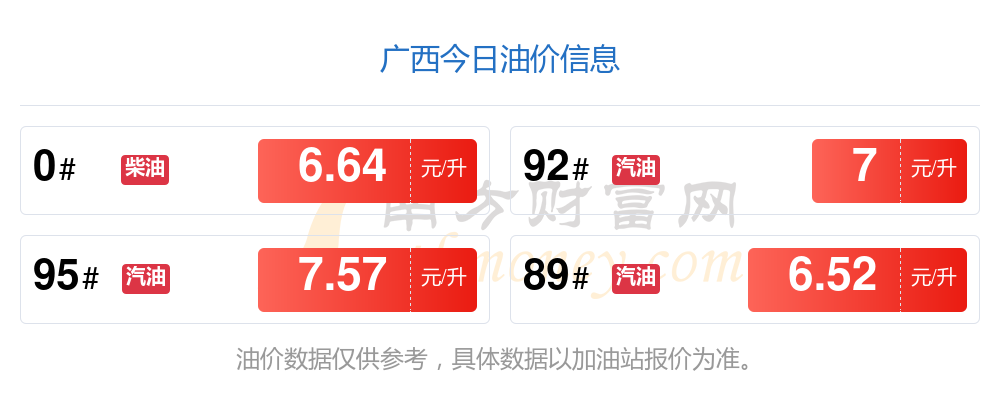 以上數(shù)據(jù)僅供參考,請以您所在地區(qū)的加油站實(shí)際售價(jià)為準(zhǔn)。南方財(cái)富網(wǎng)發(fā)布此信息的目的在于傳播更多信息,對使用該油價(jià)信息所導(dǎo)致的結(jié)果概不承擔(dān)責(zé)任。