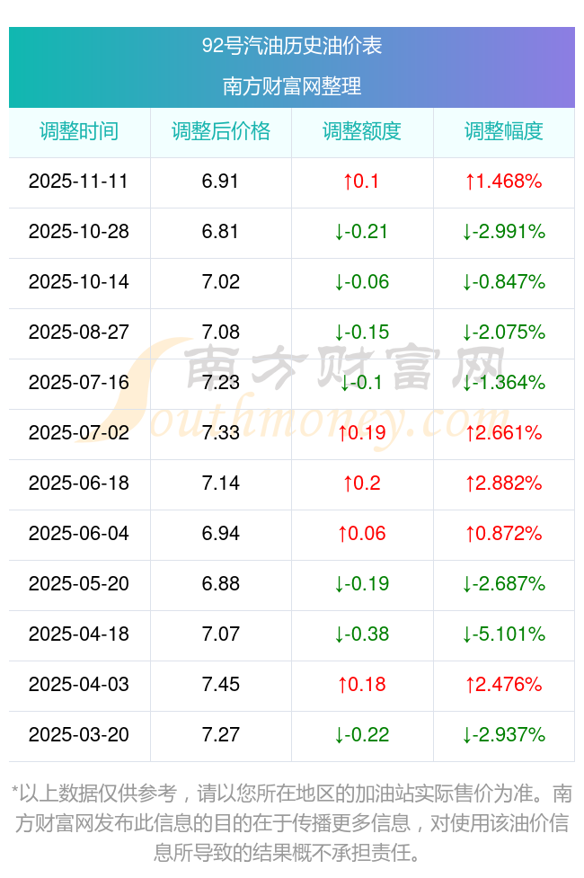 11月11日,汽油、柴油每升的價(jià)格為11月11日調(diào)整后的價(jià)格,具體為:92號(hào)汽油為6.91元,升了0.1元,升幅達(dá)1.47%;95號(hào)汽油為7.38元,升了0.11元,升幅達(dá)1.51%;89號(hào)汽油為6.43元,升了0.09元,升幅達(dá)1.42%;0號(hào)柴油為6.58元,升了0.11元,升幅達(dá)1.7%。下一輪油價(jià)調(diào)整時(shí)間11月24日24時(shí),距離現(xiàn)在還有13.21天。