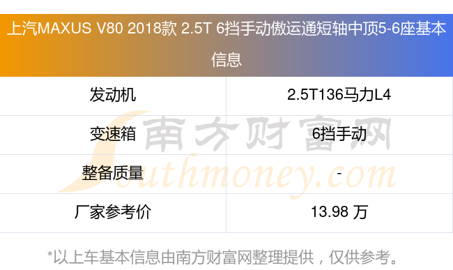 上汽MAXUS V80 2018款 2.5T 6擋手動(dòng)傲運(yùn)通短軸中頂5-6座動(dòng)力方面,搭載的是一臺(tái)2.5T136馬力L4渦輪增壓發(fā)動(dòng)機(jī),匹配6擋手動(dòng)擋變速箱,燃料形式為柴油,廠家參考價(jià)13.98萬(wàn)元。