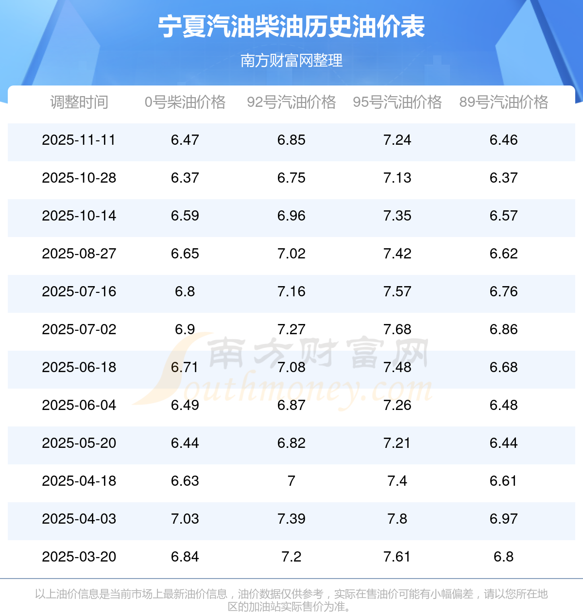 11月11日,寧夏0號柴油的價(jià)格是6.47元每升,本次的調(diào)整時(shí)間為11月11日,對比上次的調(diào)整漲了0.1元,漲1.57%,11月24日24時(shí)為下一輪油價(jià)調(diào)整時(shí)間,還有13.21天。