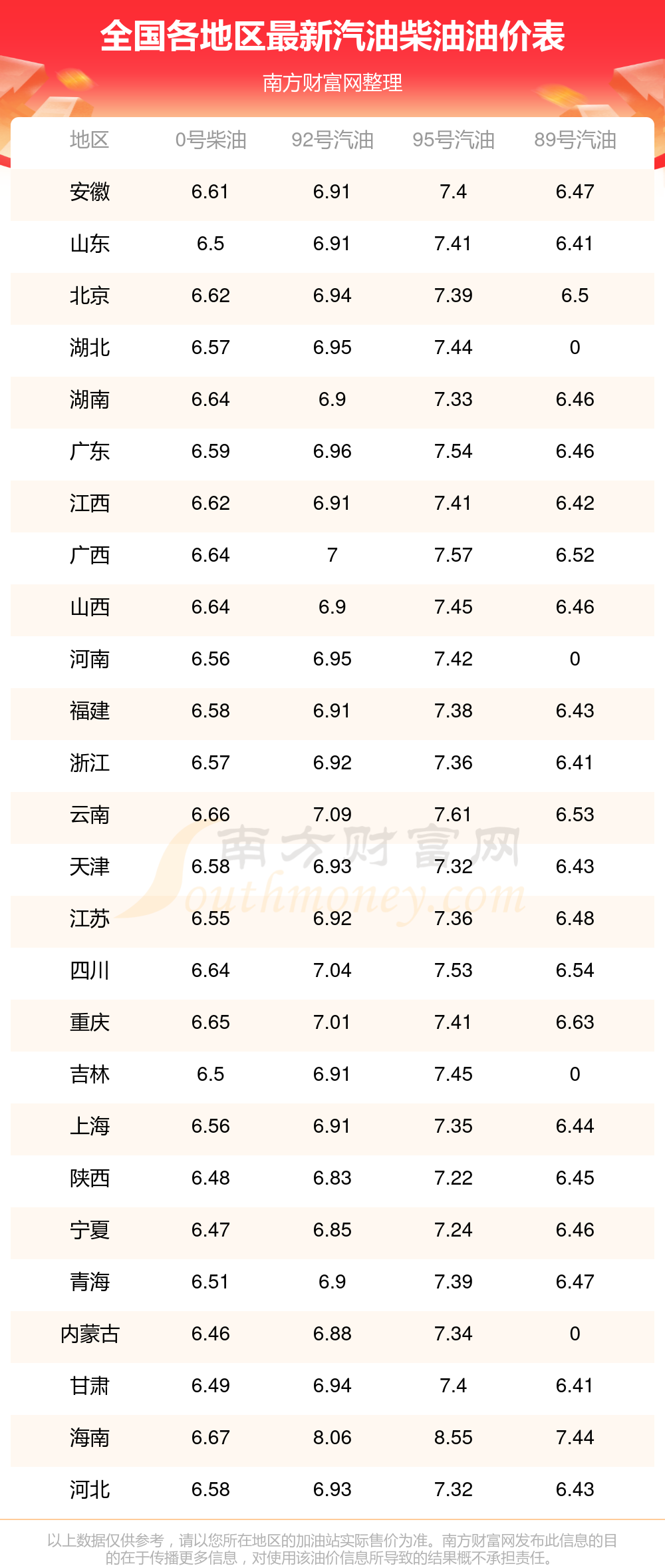 以上數(shù)據(jù)僅供參考,請以您所在地區(qū)的加油站實際售價為準。南方財富網(wǎng)發(fā)布此信息的目的在于傳播更多信息,對使用該油價信息所導致的結果概不承擔責任。