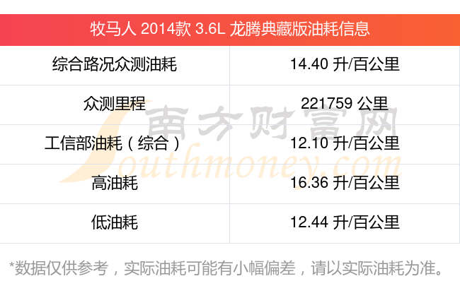 根據(jù)多位車主實測得出數(shù)據(jù),該車型低油耗為12.44升/百公里,高油耗為16.36升/百公里,綜合路況眾測油耗為14.40升/百公里,工信部綜合油耗為12.10升/百公里。