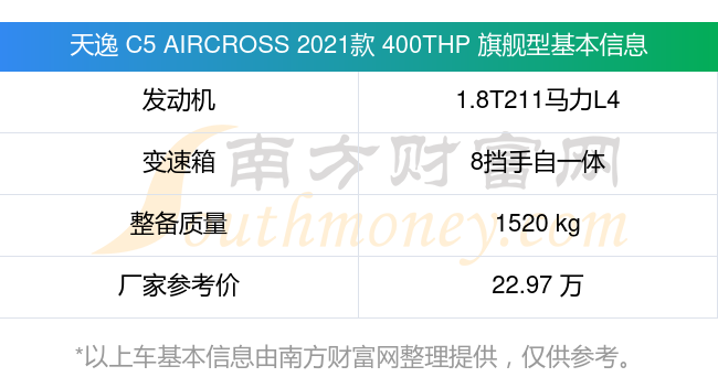天逸 C5 AIRCROSS 2021款 400THP 旗艦型動(dòng)力上配備的是一臺(tái)1.8T211馬力L4渦輪增壓發(fā)動(dòng)機(jī),匹配的是8擋手自一體自動(dòng)檔變速箱,燃料形式為汽油,常規(guī)整備質(zhì)量1520kg,廠家參考價(jià)22.97萬(wàn)元。
