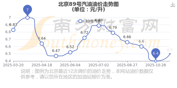11月11日,北京89號(hào)汽油的價(jià)格是6.5元每升,本次的調(diào)整時(shí)間為11月11日,對(duì)比上次的調(diào)整升了0.1元,升1.563%,11月24日24時(shí)為下一輪油價(jià)調(diào)整時(shí)間,還有13.11天。