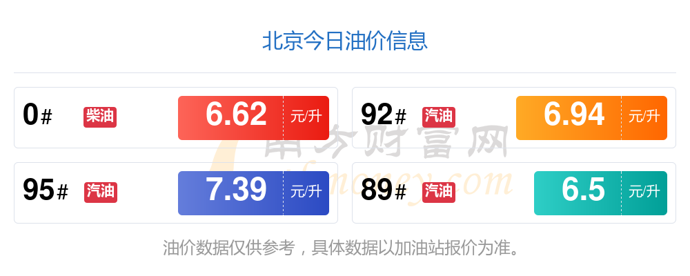 北京汽油、柴油11月11日每升最新價格為11月11日調(diào)整后的價格,具體為:92號汽油6.94元,上升了0.1元;95號汽油7.39元,上升了0.11元;89號汽油6.5元,上升了0.1;0號柴油6.62元,上升了0.1元。