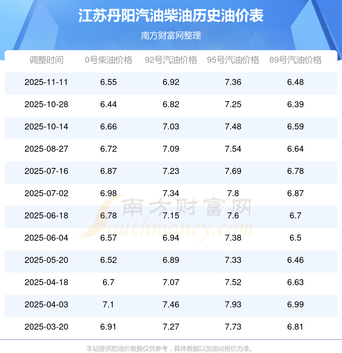 江蘇丹陽汽油、柴油11月11日每升最新價格:92號汽油為6.92元;95號汽油為7.36元;89號汽油為6.48元;0號柴油為6.55元,本輪油價調(diào)整時間為11月11日。