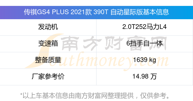 在動力方面,傳祺GS4 PLUS 2021款 390T 自動星際版搭載的是一臺2.0T252馬力L4渦輪增壓發(fā)動機,匹配6擋手自一體自動檔變速箱,燃料形式為汽油,常規(guī)整備質量1639kg,廠家參考價14.98萬元。