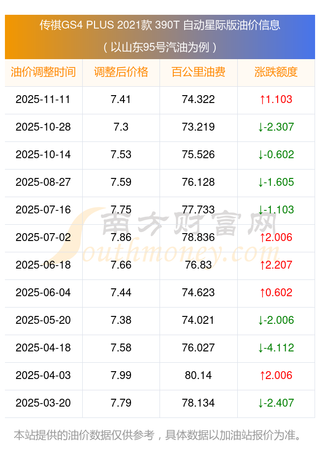 按11月11日95號汽油最新調整價格7.41元每升來計算(以山東為例),該車型百公里平均油費為74.322元,按上一輪10月28日調整價格7.3元每升來計算,百公里平均油費為73.219元,對比上一輪多花1.103元,下一輪油價調整時間為11月24日24時。